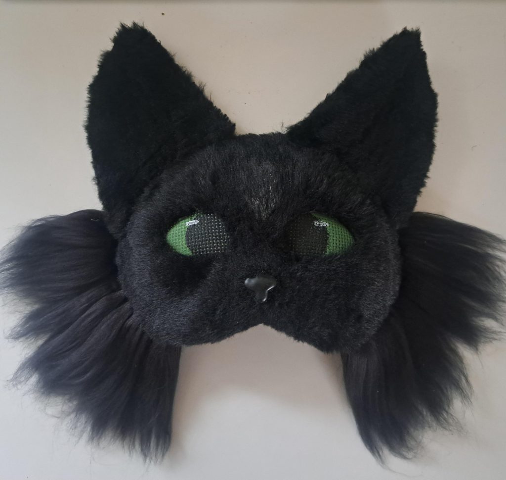 Cat mask, 2025, cardboard, wool, mesh, acrylic paint